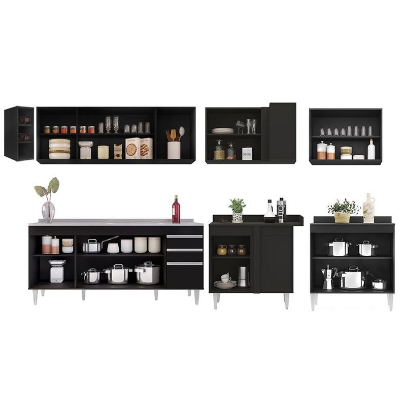 Lumil MóveisRenove a sua cozinha com o Armário de Cozinha Modulado de Canto 7 Peças CP36 com Pia Inox Preto, da Lumil, você terá tudo o que precisa ao seu alcance. Composto por 7 peças inteligentemente projetadas, esse armário modulado oferece uma distribuição interna perfeita para organizar todos os seus utensílios. Além de ser composto por peças essenciais, como balcão gabinete com pia, armários aéreos, balcão de canto com nicho garrafeiro e balcão 2 portas, esse jogo de cozinha completo ainda conta com uma maior resistência contra riscos e umidade, garantindo sua durabilidade por muito tempo, graças ao acabamento em BP. Já os pés ajustáveis permitem você nivelar o móvel em qualquer tipo de piso. Para finalizar, a pia inox completa a funcionalidade, enquanto o design contemporâneo dessa cozinha de canto harmoniza facilmente com qualquer estilo de decoração e otimiza a circulação no ambiente. Então, aproveite cada centímetro do seu espaço com esse armário de cozinha versátil e funcional. Invista em qualidade e praticidade para sua cozinha hoje mesmo! ESPECIFICAÇÕESDimensões do Produto: Largura: Superior: 270 x 131,3 cm/ Inferior: 267 x 131,5 cm. Altura: 202 cm. Profundidade: Superior: 29 cm / Inferior: 50 x 51 cm. Peso Total: 188 kg. Outras medidas: (Largura x Altura x Profundidade): Balcão Gabinete 180cm Dallas: 177 x 83 x 50 cm. Balcão 80cm Florida: 80,5 x 89 x 51 cm. Balcão de Canto Denver: 90 x 89 x 51 cm. Armário Aéreo 160cm Nevada: 160 x 54 x 29 cm. Armário Aéreo 80cm Califórnia: 80,5 x 54 x 29 cm. Armário Aéreo de Canto Austin: 90 x 54 x 50,8 cm. Nicho Riad: 20 x 54 x 27 cm. Pia Inox: 180 x 13,5 x 56 cm. Características do Produto: Material da Estrutura: MDP 15 mm. Material do fundo: MDF 3mm. Peso Suportado: 180 kg distribuídos. Acabamento: Melamina BP. Escala de brilho: Fosco. Possui Tampo: Sim. Possui Pia: Sim. Possui Portas: Sim. Material da Porta: MDP. Quantidade de Portas: 14 Portas. Tipo de dobradiças: Metálicas. Tipo de Porta: Convencional. Possui Gavetas: Sim. Material da Gaveta: MDP. Quantidade de Gavetas: 2 Gavetas. Tipo de corrediças: Metálicas. Possui Nichos: Sim. Quantidade de Nichos: 6 Nichos. Tipo de puxador: Alumínio. Possui Pés: Sim. Diferenciais: - Amplo espaço interno. - Puxadores em alumínio. - Design moderno. - Pés Reguláveis em PVC. - Balcão de canto e balcão 2 portas ambos com tampo. - Pia inox com traseiro concretado, cuba com rebaixe novitá, válvula e pino metálico. Sistema de Montagem: Parafusos e Cavilhas. Manual de Montagem: Sim. Complexidade da Montagem: Alta. Conteúdo da Embalagem: 1 Balcão 180cm, 1 Armário Aéreo 160cm, 1 Armário Aéreo 80cm, 1 Balcão 80cm, 1 Balcão de canto, 1 Armário Aéreo de Canto, 1 Nicho, 1 Pia Inox 180cm. Garantia do Fabricante: 90 dias contra defeitos de fabricação. Volumes: 9 Volumes. Montagem: Recomendamos que seja feita por um profissional. Recomendação de Limpeza: Utilize pano levemente úmido. Observações importantes: - Produto para uso residencial em ambiente interno, não devendo ficar exposto diretamente ao sol, calor e umidades excessivas. - Pode haver alguma diferença de tonalidade entre a imagem e o produto real, por conta do tratamento de imagens e a calibração de cores do seu monitor. - As imagens são meramente ilustrativas, não acompanham objetos de decoração e eletrônicos. - Ao receber a mercadoria, o cliente deve verificar as condições da embalagem, caso haja alguma avaria não assine o comprovante de recebimento. - Montagem, desmontagem e outras instalações serão de responsabilidade do cliente. Não nos responsabilizamos, no ato da entrega, por subir escadas/elevadores ou pelo transporte por guincho em apartamentos. Eventuais despesas são de responsabilidade do comprador. - Confira as dimensões do produto e certifique-se de que passará normalmente por supostos elevadores, portas, escadas e/ou corredores de sua residência.