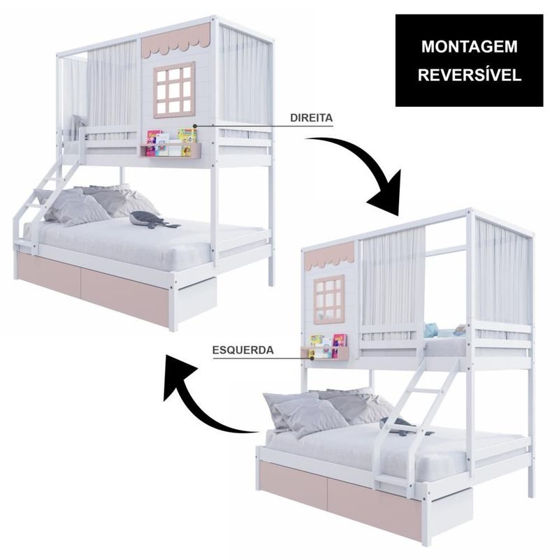 Diferenciais: Escada com Leve Curvatura, Cortina, 02 Gavetas, Casinha com fechamento em MDF, Janela e Prateleira para Livros e Decoração, Montagem Reversível (Lado Direito ou Lado Esquerdo)