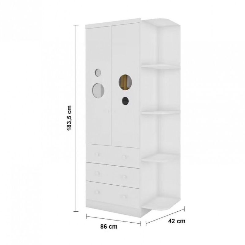 Seja no quarto, sala ou outro ambiente, a Comoda Duda Peroba combina funcionalidade e estilo, sendo uma adicao elegante e pratica para o lar. Guarda-Roupa Infantil O Guarda-Roupa Infantil Duda e projetado para seguranca e praticidade no universo infantil, feito integralmente em MDF com pintura atoxica para um ambiente saudavel. Com estrutura robusta de 12mm, puxadores em plastico, cabideiros metalicos e gavetas com corredicas telescopicas, oferece durabilidade e facilidade de uso. Possui dois modelos de rodapes para personalizacao e portas com detalhes em PETG cristal para visualizacao interna. As quatro prateleiras externas sao ideais para decoracao e brinquedos, mantendo o quarto organizado e acolhedor.