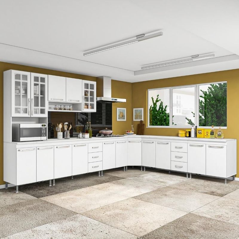 Os módulos são avulsos (cada peça é independente uma da outra) possibilitando assim vários arranjos, o espaço interno, que vem com prateleiras e divisórias, é ótimo para organização dos utensílios e mantimentos. Fabricados em material resistente, como chapas de MDP 15mm, corrediças telescópicas e dobradiças metálicas. Com puxadores cromados em ABS, pés em plástico com regulagem de altura.