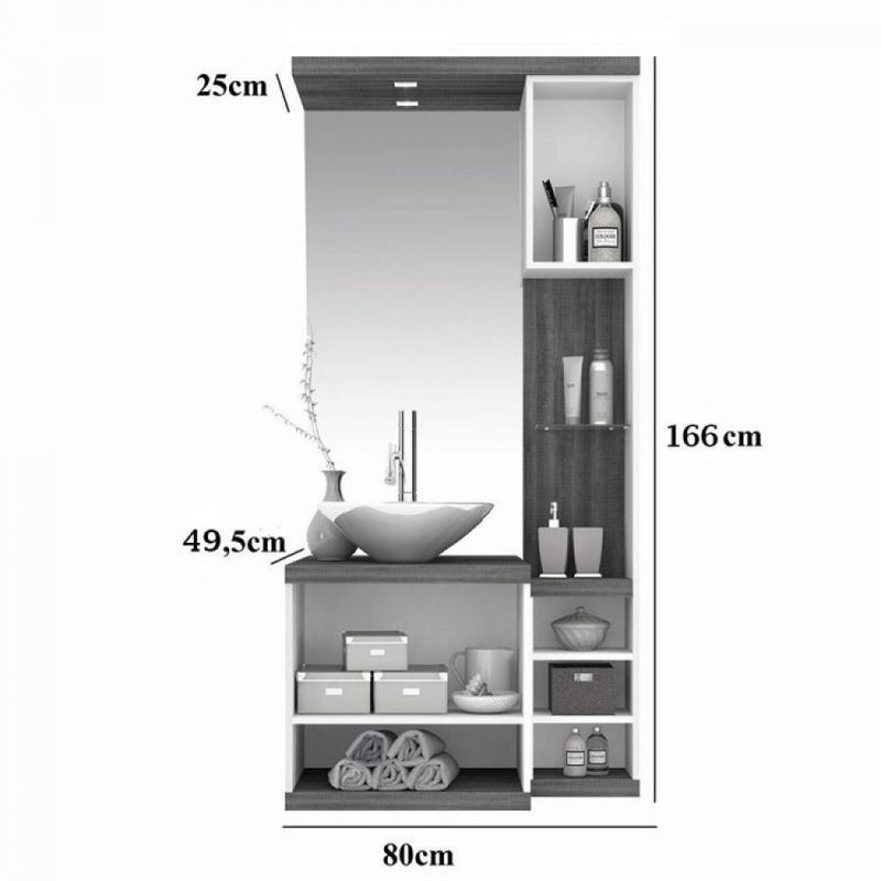 Itens Inclusos: 1 Espelheira com Espelho e Lâmpada, 1 Gabinete sem Cuba e sem Torneira e Manual de Montagem.