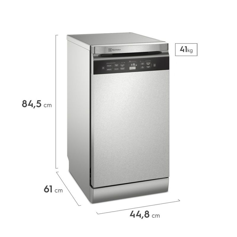 ALava Louças 10 Serviços LL10X é o produto que faltava para você. O consumo de água é de 9,5L por ciclo, sendo que a mesma quantidade de louças lavada a mão consome cerca de 90L. Economize água e tempo para lavar suas louças. Higienize suas compras de forma prática e eficaz com o programa higienizar compras. Com a função Higienizar Louça, aLava LouçaS utiliza água que atinge até 70°C, garantindo a alta performance. O Programa Inteligente/Auto Sente identifica o nível de sujeira das louças e automaticamente programa o ciclo de lavagem ideal. O recurso exclusivoElectrolux De Display Digital com Controle do Tempo permite que você saiba qual o tempo da lavagem e quanto falta para finalizá-lo, sobrando mais tempo livre para estar com sua família e amigos. ALavadora de louças Conta com cesto de talheres removível, que facilita o carregamento e com bom uso, evitando riscos. O Design do painel oferece modernidade e facilidade na hora de limpá-lo. Uma lava louças completa, aLavadora Conta com o Programa Adiar Início, que permite que o ciclo seja programado para o momento ideal e adiá-lo, se for necessário. Seu cesto intermediário ajustável em duas posições permite maior flexibilidade para o carregamento. Conte com a Função Pré-Lavar, que enxagua e tira o excesso da sujeira sem deixar resíduos e odores, permitindo o acúmulo de grandes quantidades de louça para utilizar um ciclo completo e Função Trava Painel, que evita o acionamento indevido, oferecendo maior segurança a sua família. A modernidade e o design na cor inox combinam com qualquer ambiente. Caso queira acelerar o ciclo, selecione o Programa Express 30’, ideal para utensílios pouco sujos